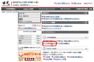 まずウェブステーションにログインします。そしたら次に中央中段(左記画像赤枠参照)の「ご利用明細照会」をクリック
